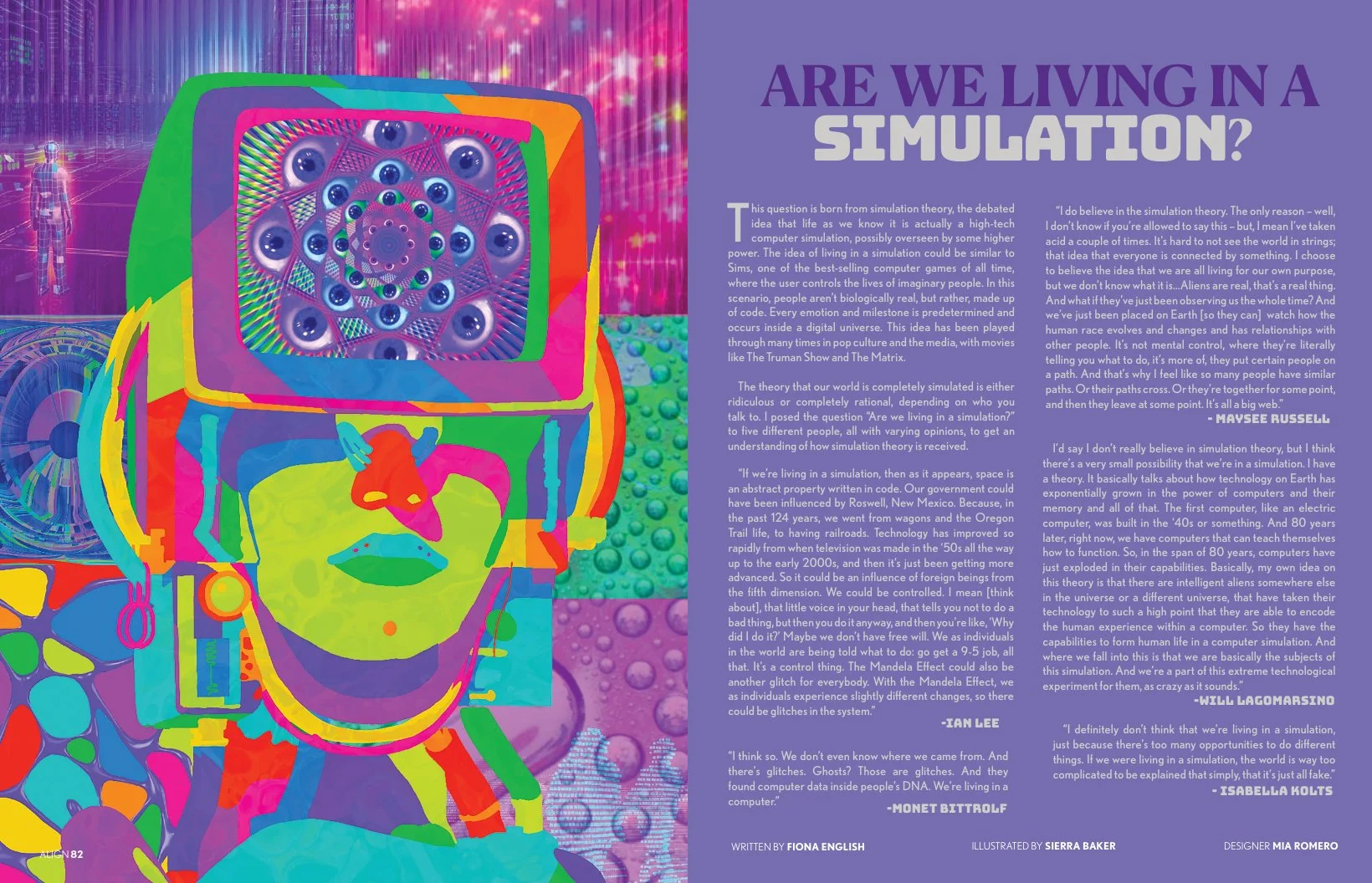 By prompting five of my peers with the question “are we living in a simulation?”, I discovered unique perspectives on the way the universe works, the possibility of aliens, ghosts, and more— and wrote it all down for Align Magazine.