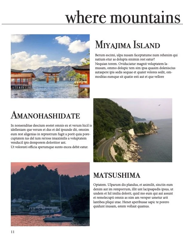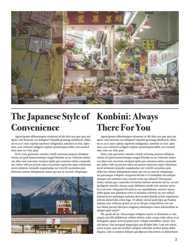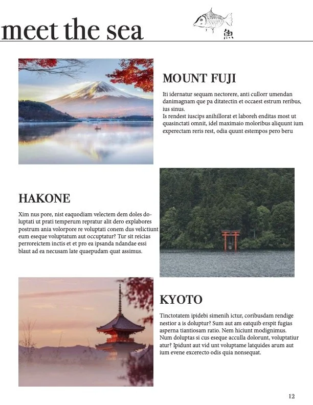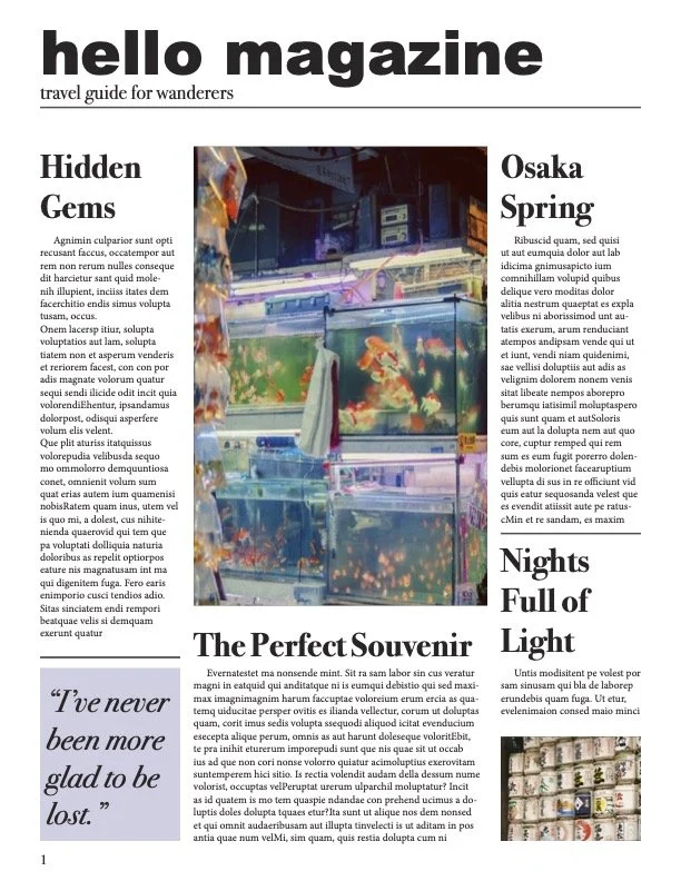 For my final assignment in Intro to Media Design, I created a 16 page travel magazine titled “101 things to do in Japan”. Through this project, I strengthened my copywriting and Adobe InDesign skills, and created a publication that reflects both my design style and my passion for travel.